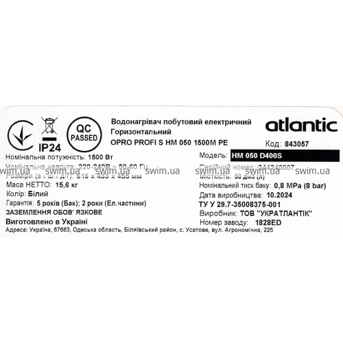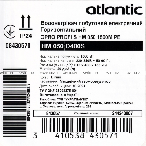 Водонагрівач побутовий електричний Atlantic Opro Horizontal HM 050 D400S (1500W) 843057