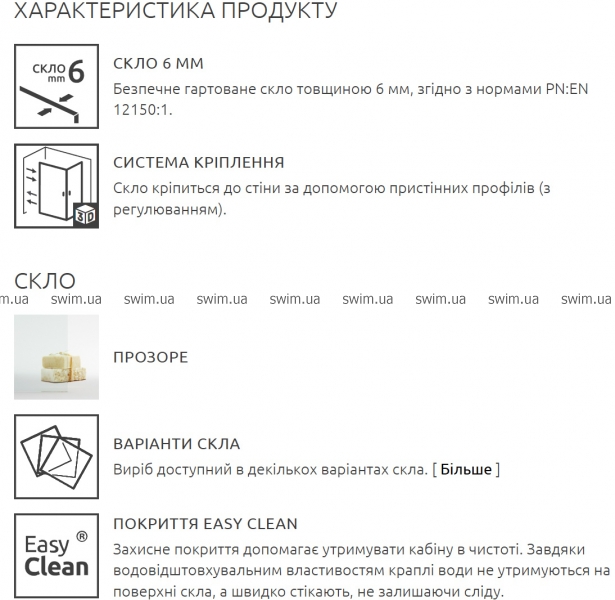 - Покриття скла EasyClean- захисне покриття допомагає утримувати кабіну в чистоті. Завдяки водовідштовхувальним властивостям краплі води не утримуються на поверхні скла, а швидко стікають, не залишаючи сліду.