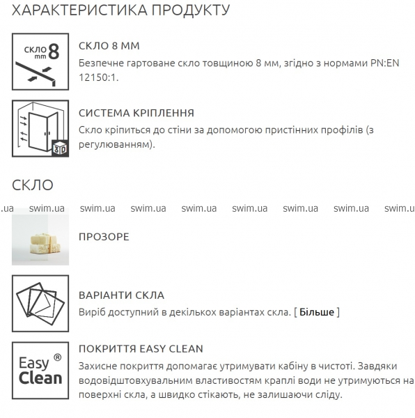 - Покриття скла EasyClean- захисне покриття допомагає утримувати кабіну в чистоті. Завдяки водовідштовхувальним властивостям краплі води не утримуються на поверхні скла, а швидко стікають, не залишаючи сліду.