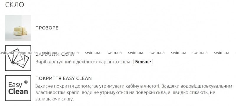 • Покриття скла EasyClean- pахисне покриття допомагає утримувати кабіну в чистоті. Завдяки водовідштовхувальним властивостям краплі води не утримуються на поверхні скла, а швидко стікають, не залишаючи сліду.