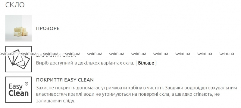 - Покриття скла EasyClean- pахисне покриття допомагає утримувати кабіну в чистоті. Завдяки водовідштовхувальним властивостям краплі води не утримуються на поверхні скла, а швидко стікають, не залишаючи сліду.