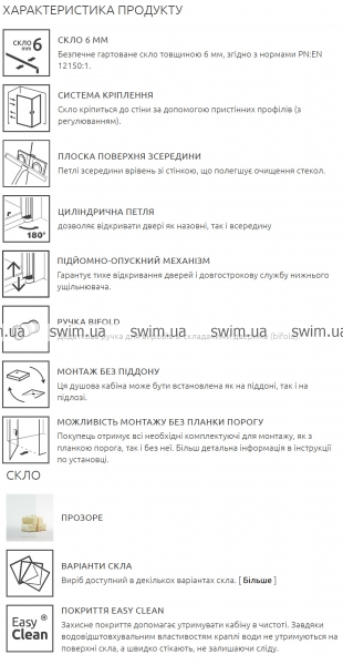 - Покриття EASY CLEAN.Захисне покриття допомагає утримувати кабіну в чистоті. Завдяки водовідштовхувальним властивостям краплі води не утримуються на поверхні скла, а швидко стікають, не залишаючи сліду