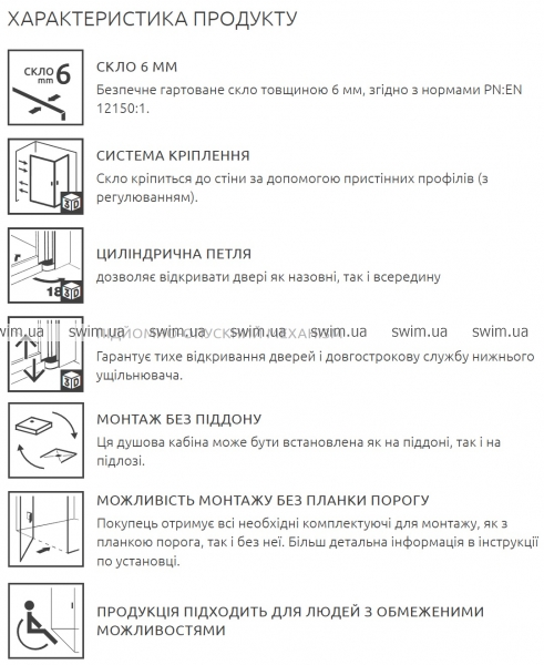 - Скло 6 мм. Безпечне гартоване скло товщиною 6 мм, згідно з нормами PN:EN 12150:1.