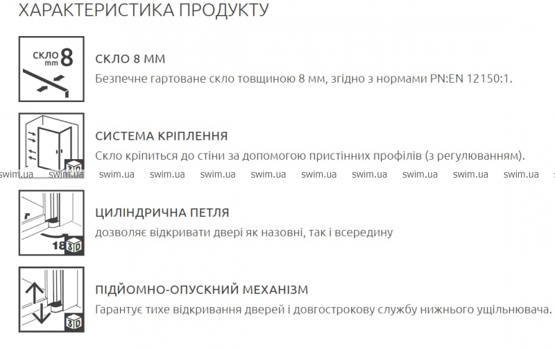 - Безпечне гартоване скло товщиною 8 мм, згідно з нормами PN:EN 12150:1.