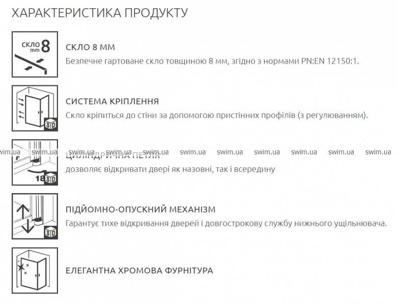- Безпечне гартоване скло товщиною 8 мм, згідно з нормами PN:EN 12150:1.