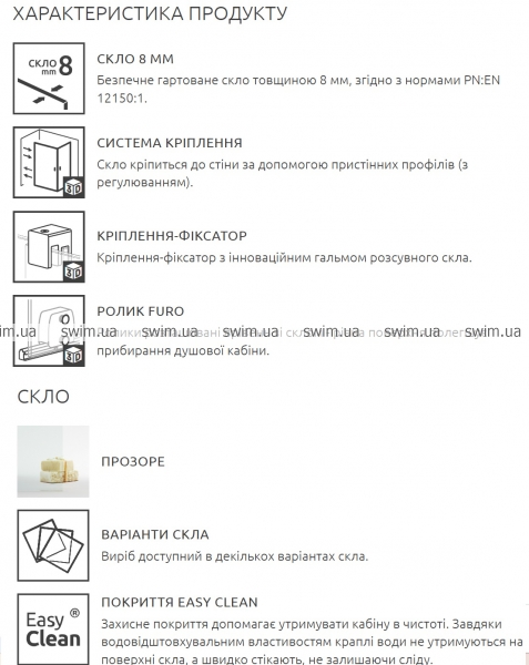 - Покриття EASY CLEAN. Захисне покриття допомагає утримувати кабіну в чистоті. Завдяки водовідштовхувальним властивостям краплі води не утримуються на поверхні скла, а швидко стікають, не залишаючи сліду.