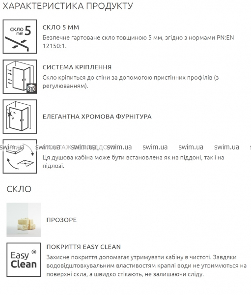 - Покриття EasyClean. Захисне покриття допомагає утримувати кабіну в чистоті. Завдяки водовідштовхувальним властивостям краплі води не утримуються на поверхні скла, а швидко стікають, не залишаючи сліду.Монтаж без піддону.Ця душова кабіна може бути встановлена як на піддоні, так і на підлозі.