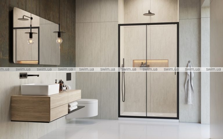 Завдяки розсувному механізму відкривання дверей кабіни ідеально підходять для приміщень з обмеженим простором. Їхні чорні профілі, стильні ручки та ущільнювачі надають ванній кімнаті сучасного вигляду, підкреслюючи індивідуальний характер інтер’єру.