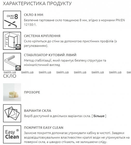 - Покриття скла EasyClean- захисне покриття допомагає утримувати кабіну в чистоті. Завдяки водовідштовхувальним властивостям краплі води не утримуються на поверхні скла, а швидко стікають, не залишаючи сліду.