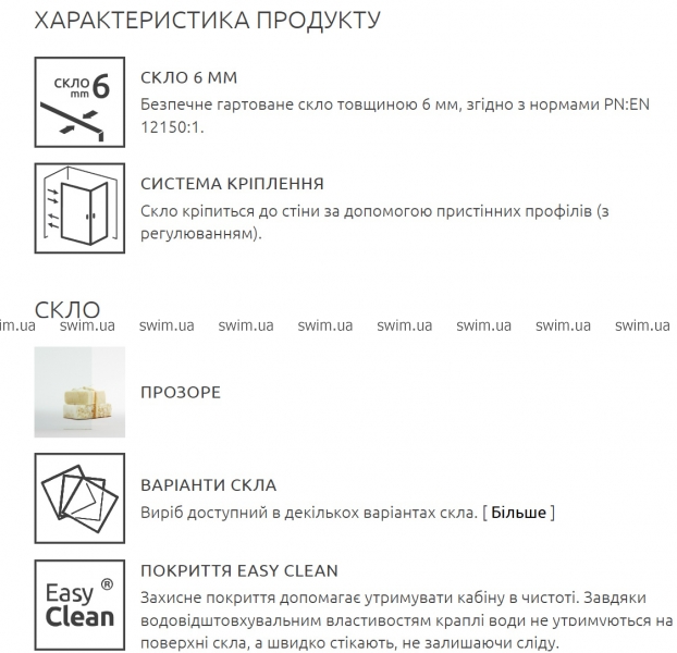- Покриття EASY CLEAN. Захисне покриття допомагає утримувати кабіну в чистоті. Завдяки водовідштовхувальним властивостям краплі води не утримуються на поверхні скла, а швидко стікають, не залишаючи сліду.