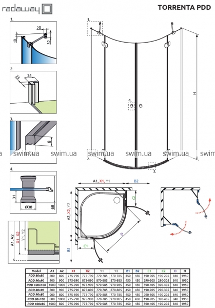 Душові кабіни серії TORRENTA можна монтувати як на піддони, так і безпосередньо на підлогу (на плитку). У разі монтажу на плитку рекомендуємо використовувати душові плити — для якісної гідроізоляції, правильного відведення води та пришвидшення встановлення.