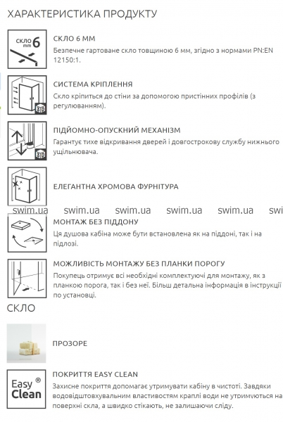 - Покриття EASY CLEAN. Захисне покриття допомагає утримувати кабіну в чистоті. Завдяки водовідштовхувальним властивостям краплі води не утримуються на поверхні скла, а швидко стікають, не залишаючи сліду.