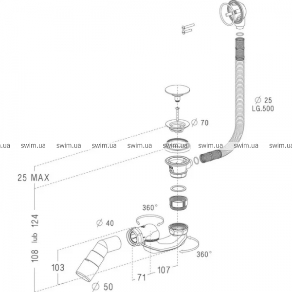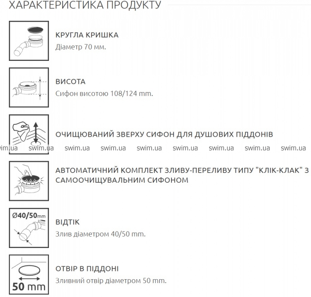 - Призначений для стандартних ванн та глибоких піддонів із зливним отвором Ø 50 мм.