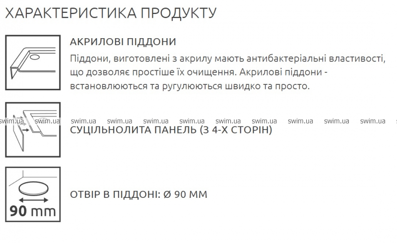 - Піддони, виготовлені з акрилу мають антибактеріальні властивості, що дозволяє простіше їх очищення. Акрилові піддони - встановлюються та ругулюються швидко та просто