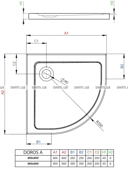 - Отвір в піддоні: Ø90мм – по середині довгої сторони