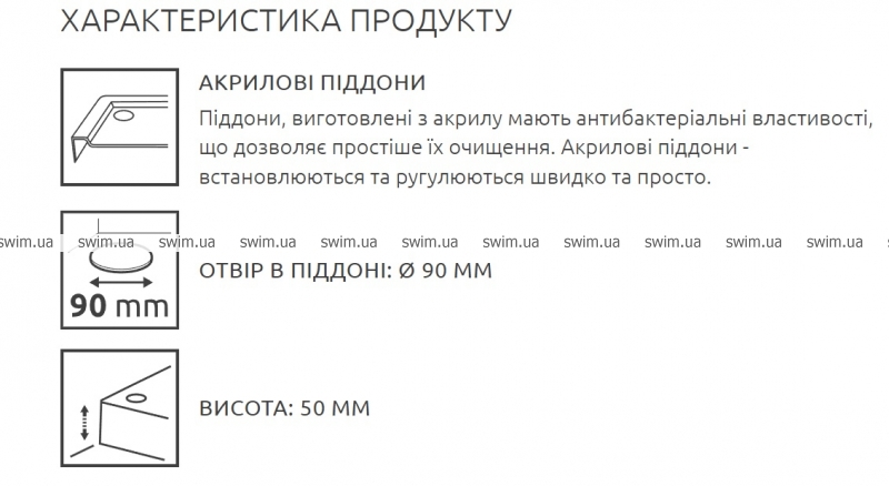 - Піддони, виготовлені з акрилу мають антибактеріальні властивості, що дозволяє простіше їх очищення. Акрилові піддони - встановлюються та ругулюються швидко та просто