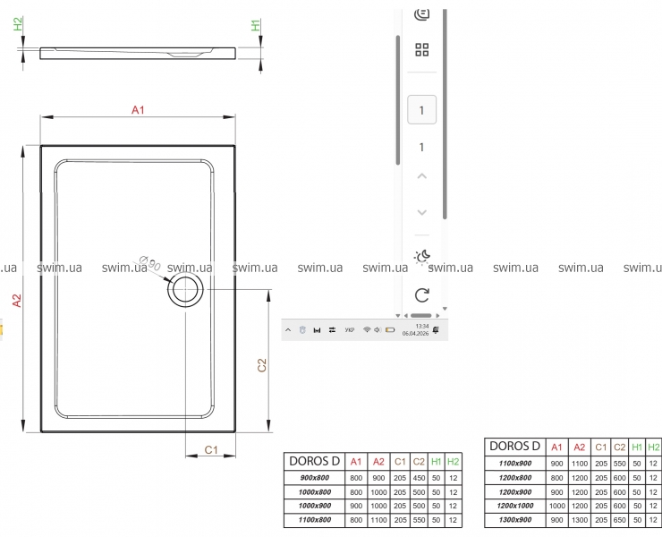 - Отвір в піддоні: Ø90мм – по середині довгої сторони