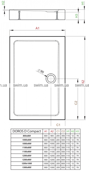 Плаский, прямокутний акриловий піддон з цільнолитою панеллю (з 4 сторін). Призначений для монтажу на ніжках (в комплекті). Отвір під сифон Ø90мм по середині довгої сторони. Рекомендовані сифони: R500, R 580, R510, R400 SLIM, R400W Slim.