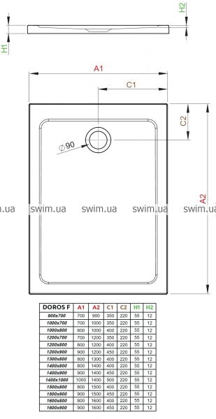 Плаский, прямокутний акриловий піддон. Призначений для монтажу безпосередньо на підлогу. Отвір під сифон Ø90мм – по середині короткої сторони. Рекомендовані сифони: TB90, TB21, TBXS, R500, R510, R580, R400 SLIM, R400W SLIM.