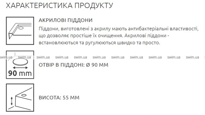 - Отвір в піддоні: Ø90 мм