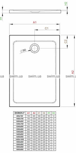 Плаский, прямокутний акриловий піддон. Призначений для монтажу безпосередньо на підлогу. Отвір під сифон Ø90мм – по середині короткої сторони. Рекомендовані сифони: TB90, TB21, TBXS, R500, R510, R580, R400 SLIM, R400W SLIM.