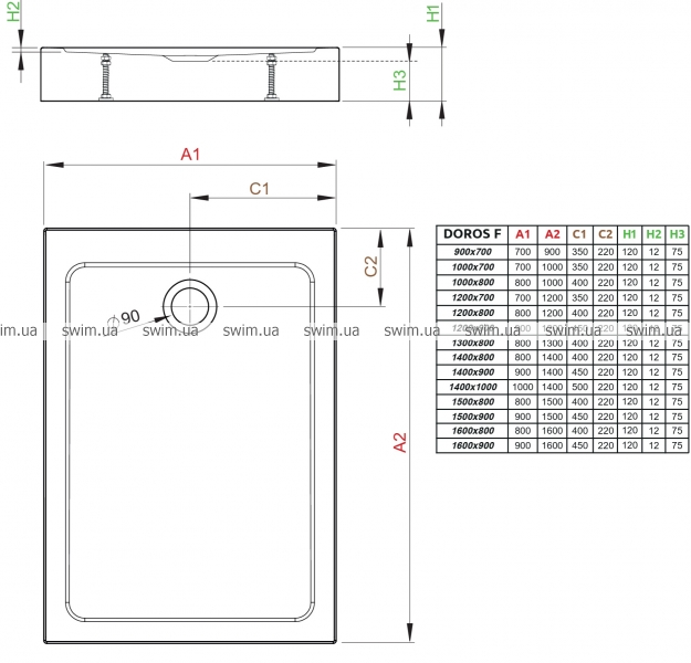 Плаский, прямокутний акриловий піддон. Призначений для монтажу безпосередньо на підлогу. Отвір під сифон Ø90мм – по середині короткої сторони. Рекомендовані сифони: R500, R580, R510, R400 SLIM.