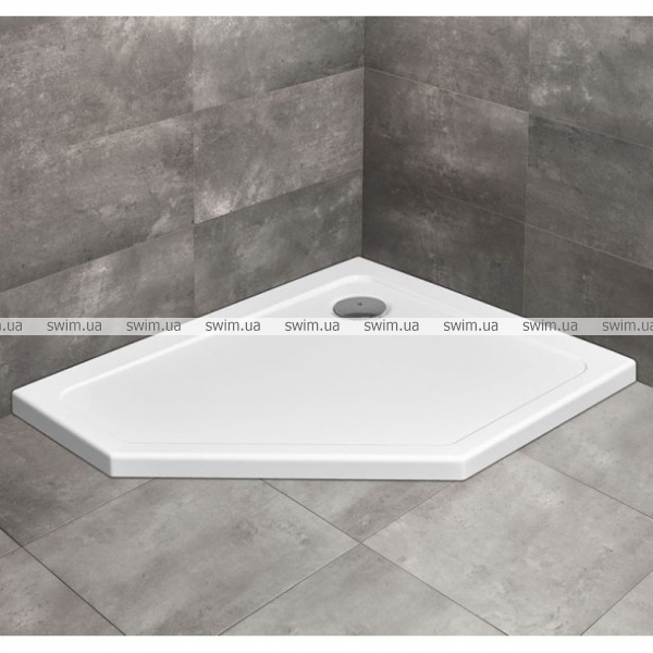 Плаский, 5-кутний акриловий піддон. Призначений для монтажу безпосередньо на підлогу. Отвір під сифон Ø90мм. Рекомендовані сифони TB90, TB21, TBXS, R500, R580, R510, R400 SLIM, R400W SLIM.