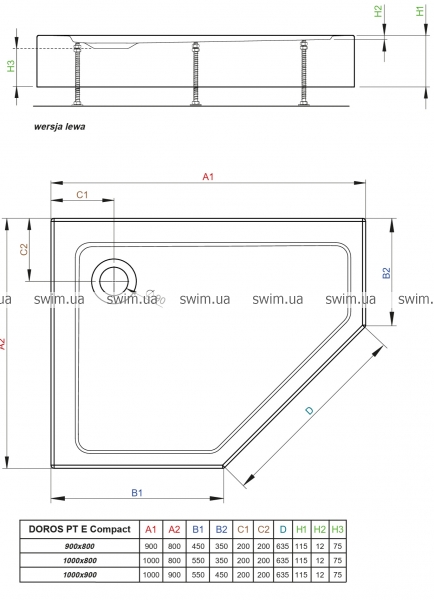 Плаский, 5-кутовий акриловий піддон з цільнолитою панеллю (з 5-ти сторін). Призначений для монтажу на ніжках (у комплекті). Отвір для сифону Ø90мм. Рекомендований сифон: R500, R580, R510, R400 SLIM, R400W SLIM.