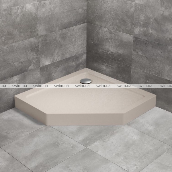 Плаский, 5-кутний акриловий піддон. Призначений для монтажу безпосередньо на підлогу. Отвір під сифон Ø90мм. Рекомендовані сифони TB90, TB21, TBXS, R500, R580, R510, R400 SLIM, R400W SLIM.