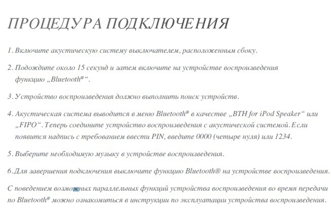 4. Акустическая система выводится в меню Bluetooth® в качестве „BTH for iPod Speaker“ или „FIPO“. Теперь соедините устройство воспроизведения с акустической системой. Еслипоявится надпись с требованием ввести PIN, введите 0000 (четыре нуля) или 1234.