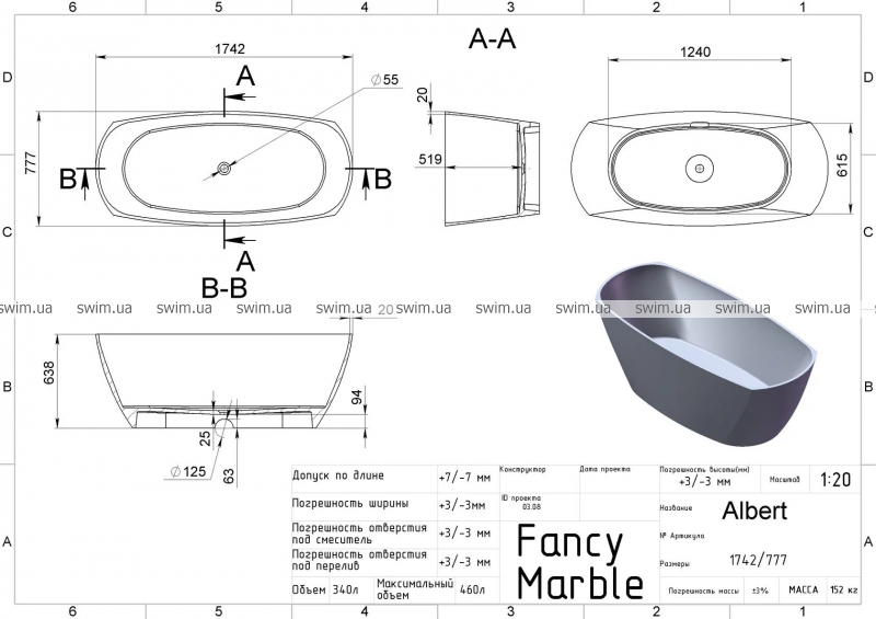 Ванна Fancy Marble Albert 10175003 170х80 см