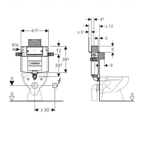 - Підведення води R 1/2", сумісне з MF, з вбудованим кутовим запірним вентилем і маховичком