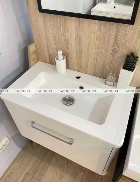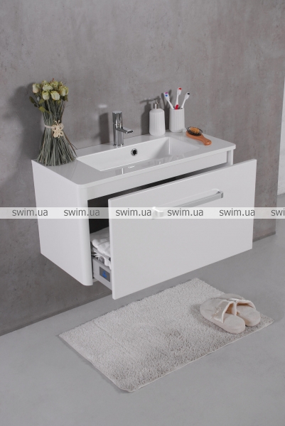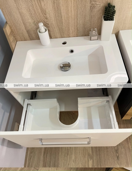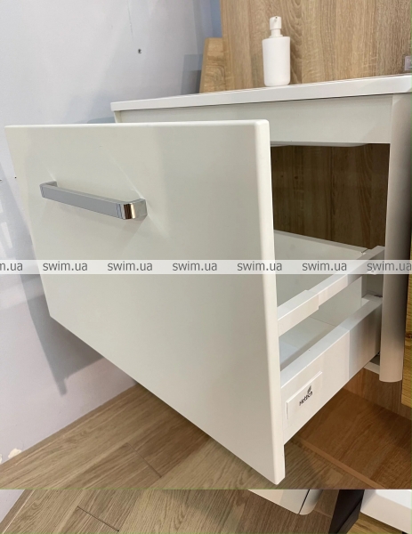 Корпус тумби та фасад виготовлений з плити МДФ, яка покрита вінілової плівкою стійкою до стирання. Висувна скринька встановлена на систему висування "Linken system" LS Box. Виріб призначений для використання у ванній кімнаті та виготовлений із якісних вологостійких матеріалів.