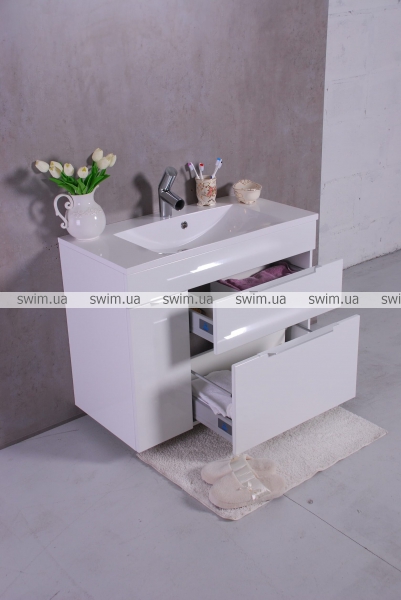 Комплект Bermuda 2 (Бермуди), шафка з умивальником торгової марки Fancy Marble. Розмір шафки 900х460х710 мм. Колір білий. Модель зустрічається для підвісного монтажу і комплектується дверцятами і розкриває ящиками симехке мед. Шафка комплектується умивальником з литого каменю, модель умивальника Amelia 900C.