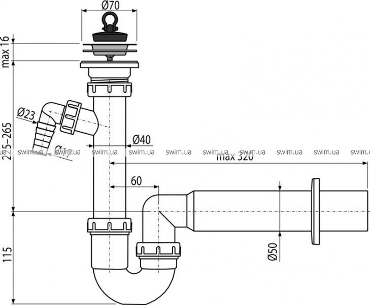 A810-DN50 СИФОН ТРУБЧАТИЙ З НЕРЖАВЕЮЧОЮ РАШИТКОЮ Ø70 І ПІДВОДКОЮ (ШТУЦЕРОМ)