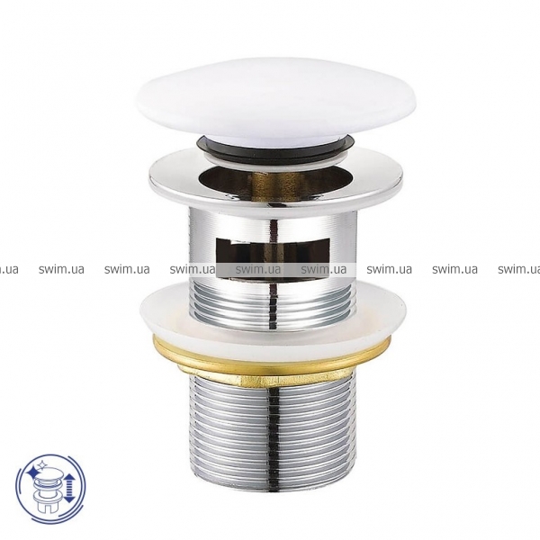 Донні клапани використовуються для блокування зливного отвору в умивальнику чи біде та запобігають зливу води, якщо її потрібно затримати в чаші на якийсь час. Дана модель виготовлена із міцної латуні та оснащена силіконовими прокладками, має білу керамічну заглушку грибоподібної форми, завдяки чому виглядає елегантно і в той же час забезпечує герметичність та надійність. Має автоматичну систему закриття та відкриття CLICK-CLACK, яка спрацьовує при натисканні на заглушку та закриває злив, повторним натисканням розблоковує його. Клапан призначений для умивальників з переливом.