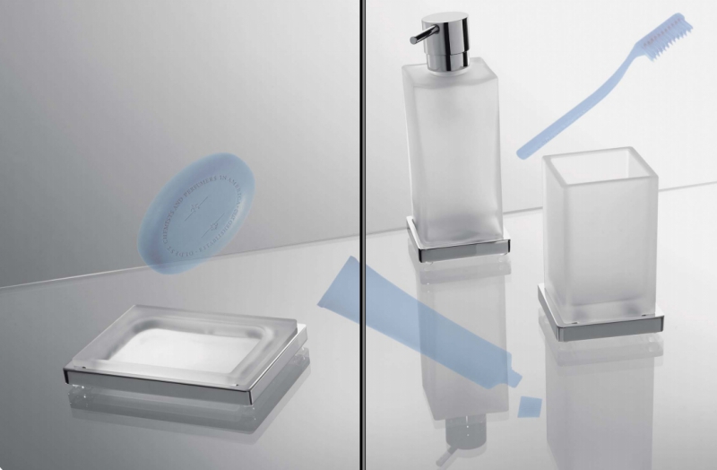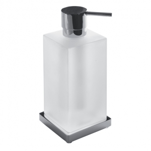 Дозатор жидкого мыла настольный Colombo Design Look B9317 имеет кубическую форму. Емкость дозатора выполена из белого матового стекла декорированная хромированным основанием. Помпа дозатора имеет плавный ход и при использовании раздает жидкое мыло равными порциями, не переливая его после нажима.