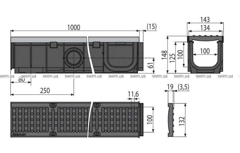 - Возможность подключения притока воды в канал сразу в четырех местах – Ø50 мм