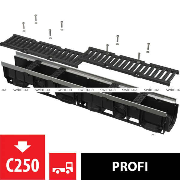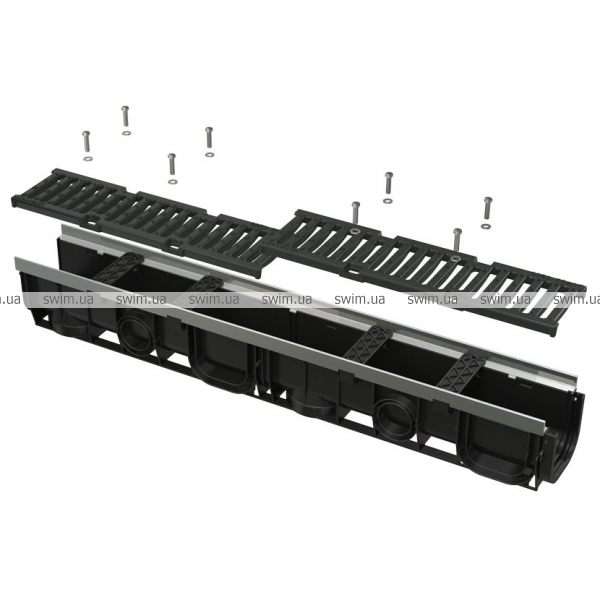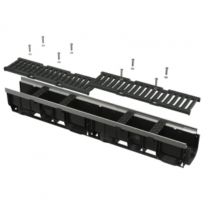 - Чугунная решетка – фиксация в корпусе канала с помощью восьми болтов из нержавеющей стали, ширина сливных щелей – 12,5 мм