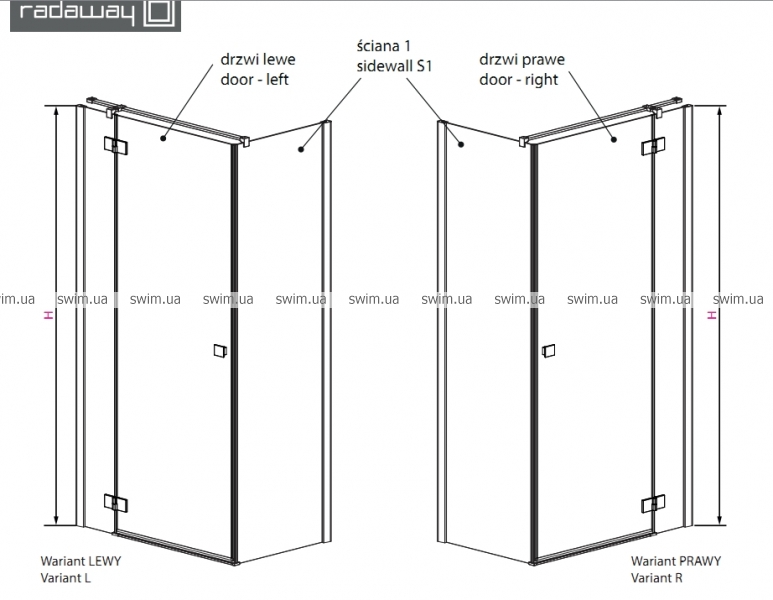 Одностворчатая, распашная дверь для квадратных или прямоугольных душевых кабин.
