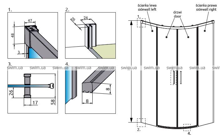 Первая коллекция в стиле настоящего минимализма — двойные ролики спрятаны внутри профилей, на пристенных профилях отсутствуют даже заглушки болтов — в место них маскировочная лента. Все изделия из этой коллекции допускается устанавливать как на поддон так и непосредственно на пол. Кроме того, все изделия допускается устанавливать с порогом или без порога меняя нижний фиксатор (в комплекте).