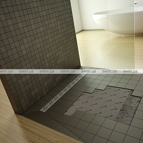 Поверхность душевых плит покрыта гидроизоляционным полотном, которое обеспечивает полную гидроизоляцию. Припуск полотна к размеру душевой плиты позволяет на полную гидроизоляцию на соединении плиты со стеной и полом.