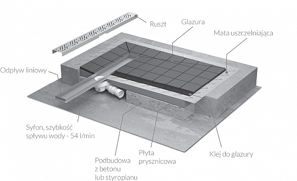 Расширяя предложение на современные и функциональные душевые плиты, особенное внимание мы обратили на обеспечение стопроцентной гидроизоляции в предлагаемых нами решениях. Душевые плиты Радавэй имеют встроенный линейный или компактный душевой трап в комплекте с сифоном, с увеличенной пропускной способностью. Душевая плита сделана с деликатным спадом в сторону трапа, что сильно упрощает укладку керамической плитки или мозаики и гарантирует, слив воды в нужном направлении. Благодаря этому избегаем разливания воды по полу во всей ванной комнате, что часто случается в случае неправильного исполнения наклона пола традиционным способом в душевой зоне.