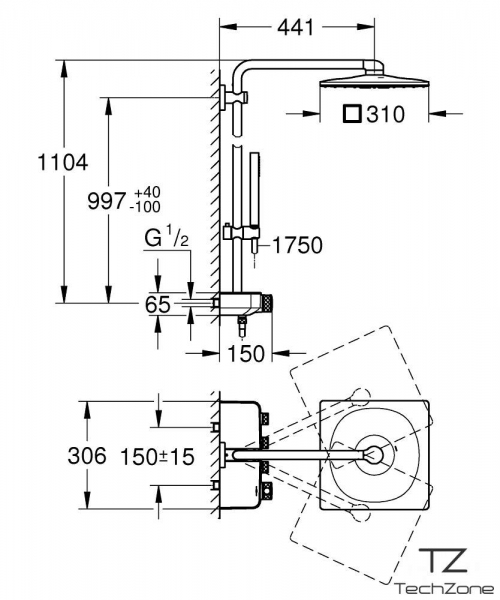 - Диаметр верхнего душа: квадрат 310 х 310 мм