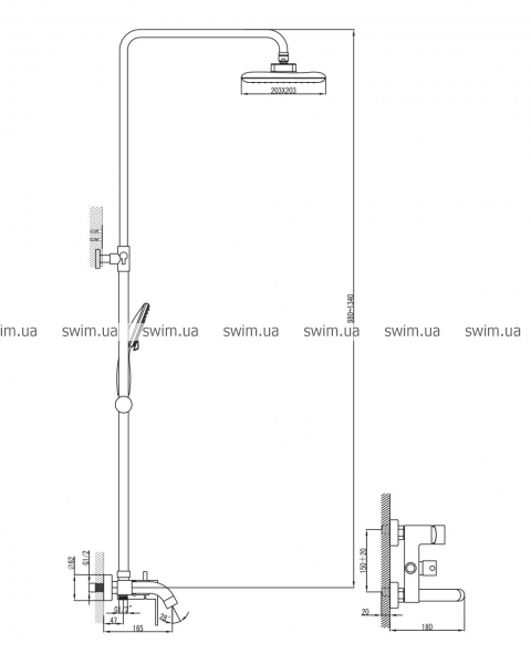 - Душевая система в комплекте: душевая штанга, смеситель для ванны/душа, верхний и ручной душ, держатель лейки