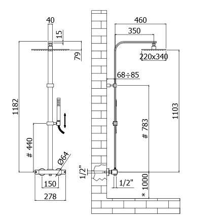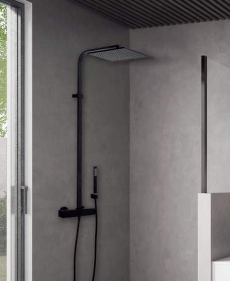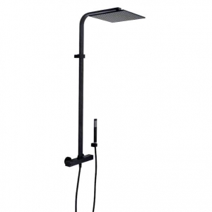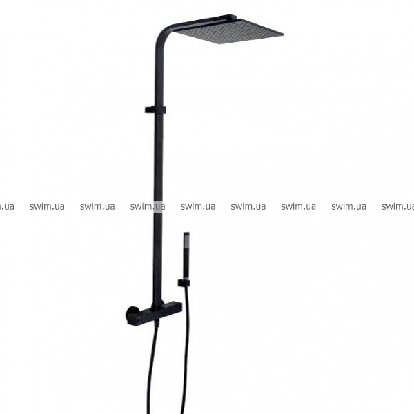 - Комплектация: стойка, термостатический смеситель, верхний душ, ручной душ, шланг 1500 мм, держатель для лейки