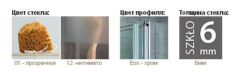 В состав серии входят пять моделей кабин, три модели дверей и три вида шторок на ванну. Все стекла идут с покрытием Easy Clean. Продукты Eos доступны в двух видах стекла: прозрачном и интимато (см. фото). Стекло интимато имеет покрытие Easy Clean с внутренней стороны и с наружной на сатиновой полосе.