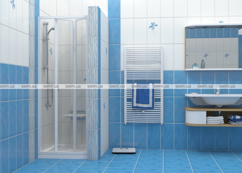 Оптимальный вариант для небольшого пространства. Поэтому используются для самых маленьких душевых уголков шириной 67-71 см. Складывающийся шарнир, который соединяет створки дверей, обеспечивает максимально возможную ширину входа и у самых узких дверей.