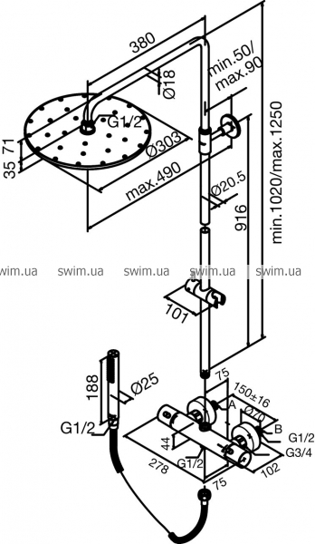 - Встроенный в термостат переключатель с ручного на верхний душ