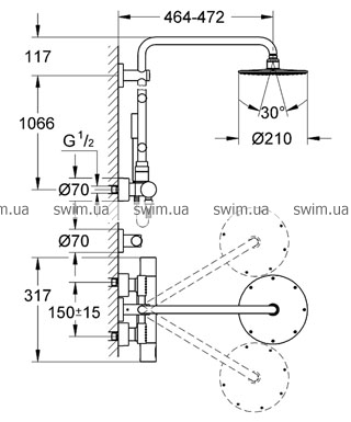 - Минимальный напор воды 10 л/мин (при отдельном использовании верхнего, ручного или боковых душей)